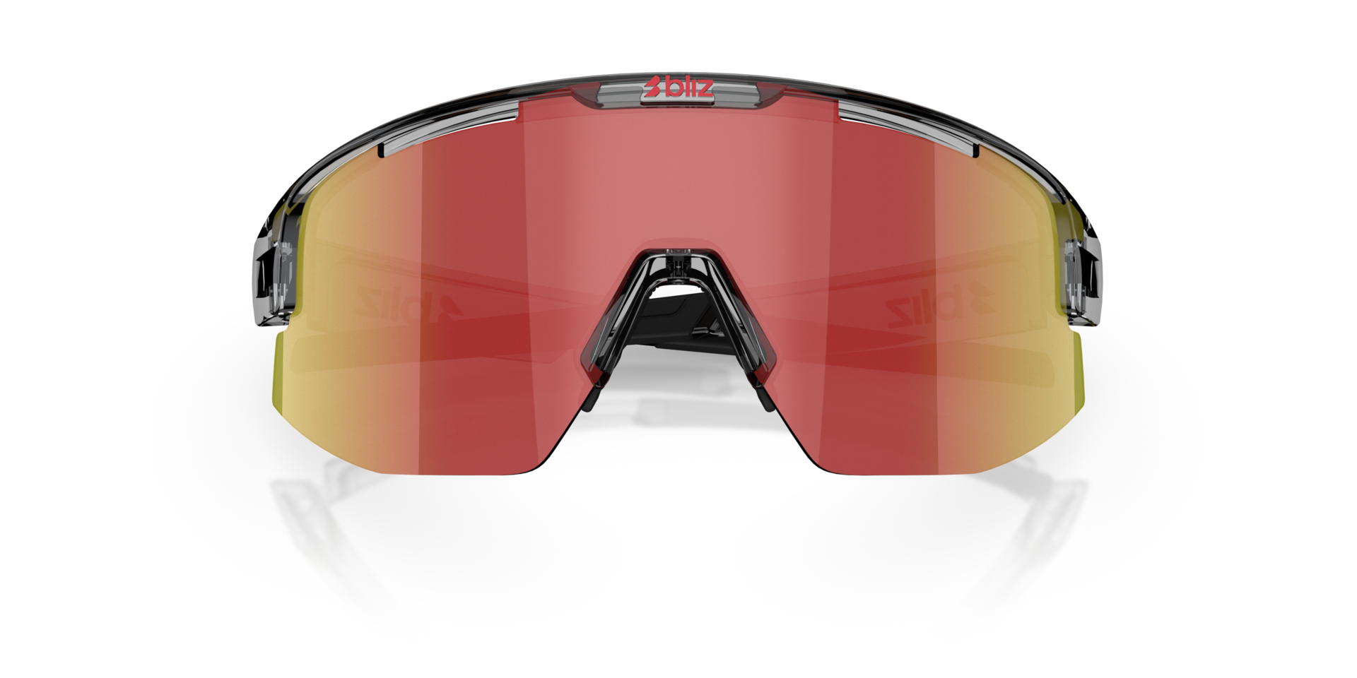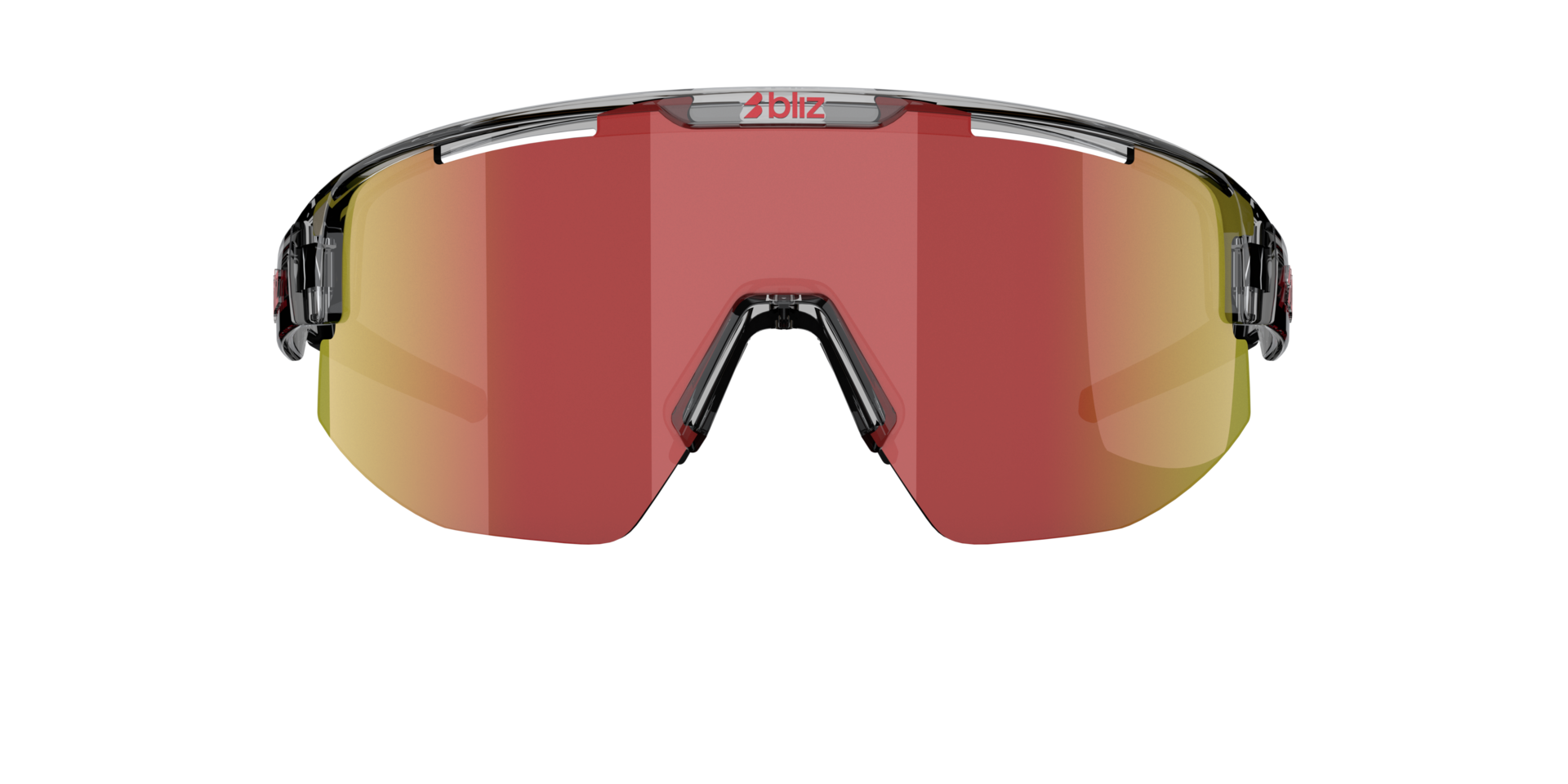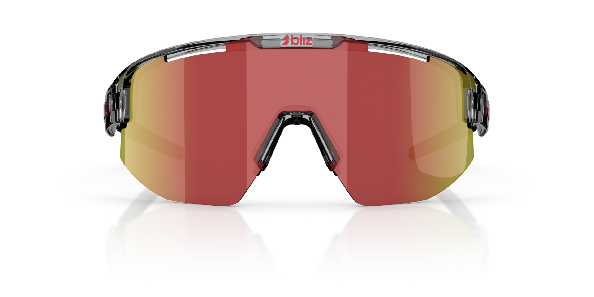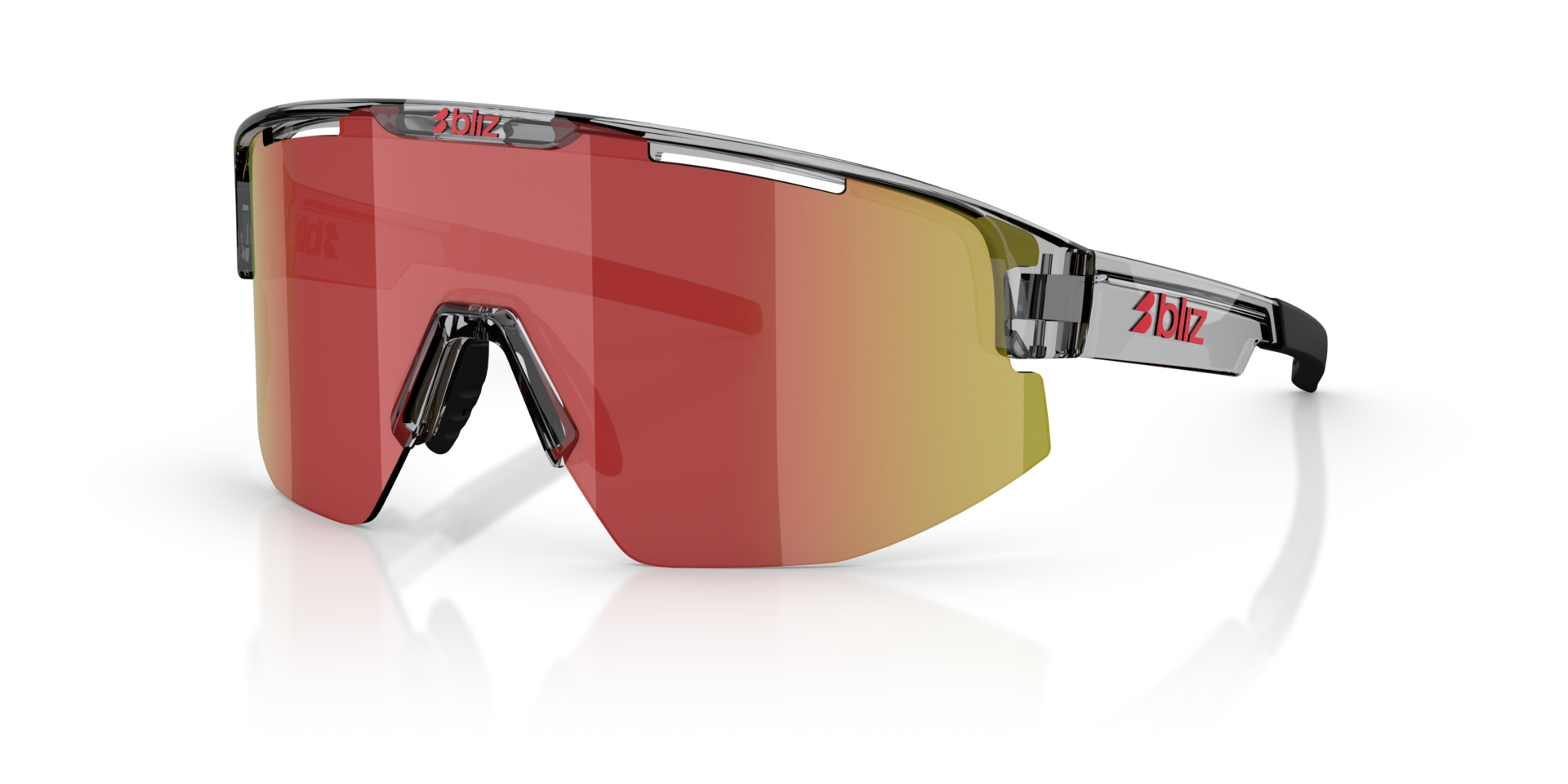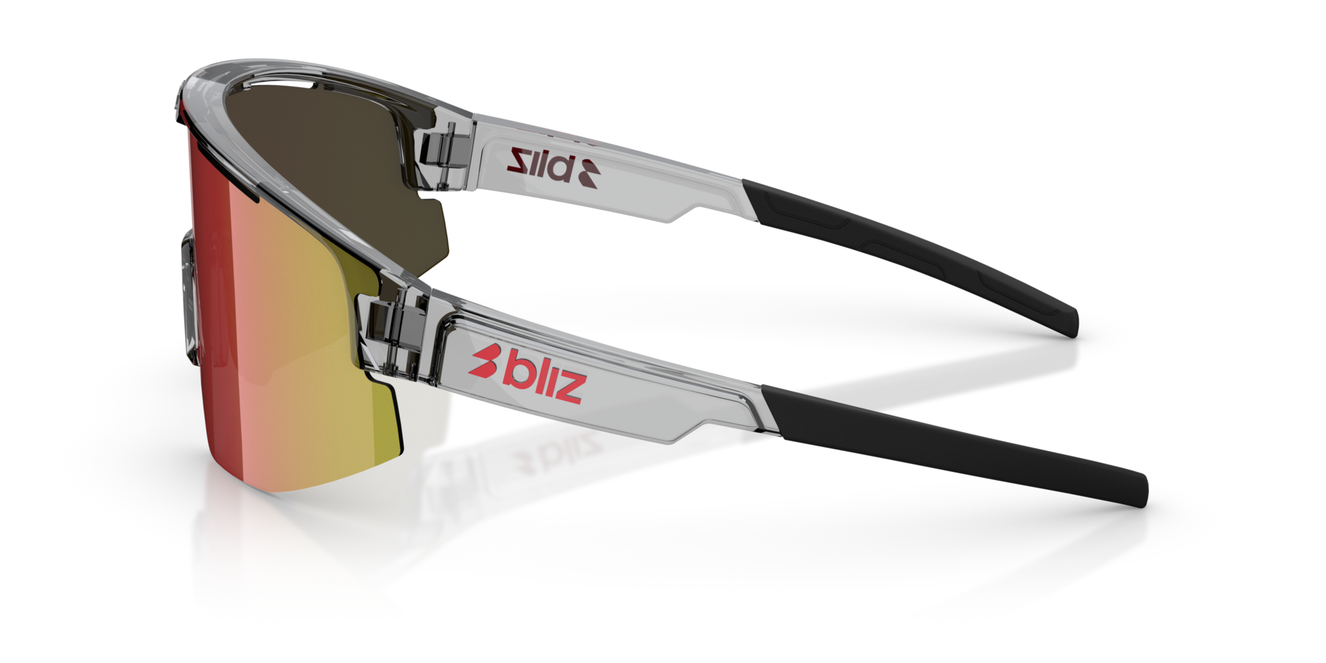 Introducing Bliz Matrix, a revolutionary new concept in sports sunglasses design. These unisex shades feature solid color - mirror red lenses with an irregular frame shape and are crafted from high-quality material for maximum durability. The transparent dark grey frames are paired with matching earpieces for a stylish look that will turn heads wherever you go.